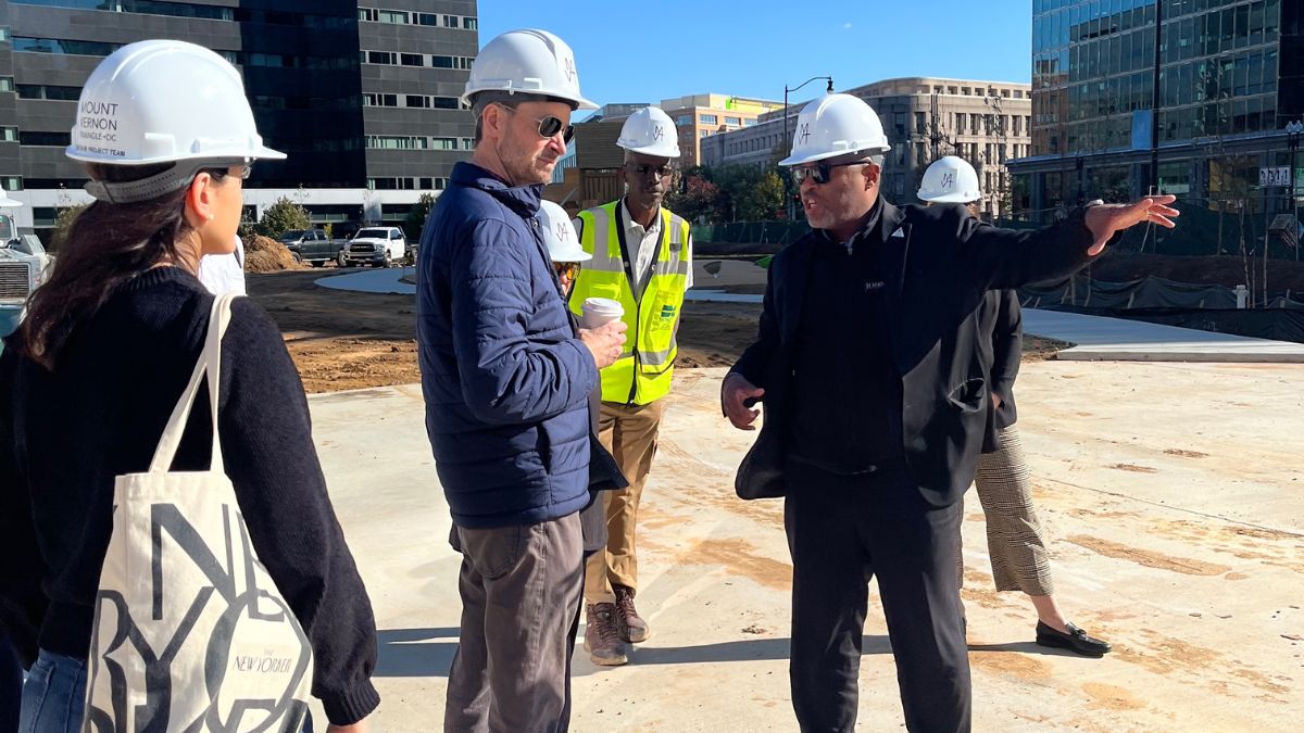 Last Friday, Ward 6 Councilmember Charles Allen joined MVT CID staff, project representatives from the DC Departments of Parks and Recreation and General Services, construction contractor, and Star Court Pavilion benefactor Myrna Sislen for a tour around the nearly complete 1.2 acre park. During the visit, Councilmember Allen was able to see firsthand the progress made to the park, stroll on the freshly finished walkway, try out some of the playground equipment (which we learned just past its quality inspection!), and experience what will soon be a first-class community gathering space right here in Mount Vernon Triangle. During the tour, MVT CID President & CEO Kenyattah Robinson was also able to share with Councilmember Allen MVT CID’s vision for future dining, art, and other public amenities (such as a restroom) in the space that could come in a future “Phase 2” development and expressed the need for specific traffic calming measures (like a crosswalk at 3rd & H Streets NW) to ensure safe pedestrian access to the park.