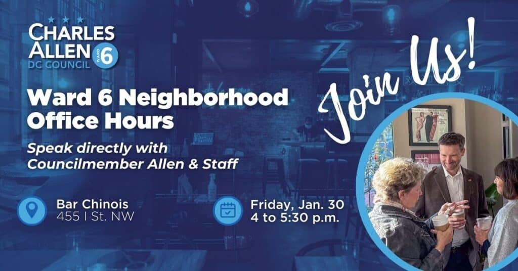 Ward 6 Councilmember, Charles Allen will be holding office hours at Bar Chinois (455 Eye St. NW) from 4:00 pm – 5:30 am on Friday, January 30. This is an opportunity for constituents to meet with the Councilmember and discuss any issues, big or small, that you want to make sure he is aware of. Be sure to RSVP here.