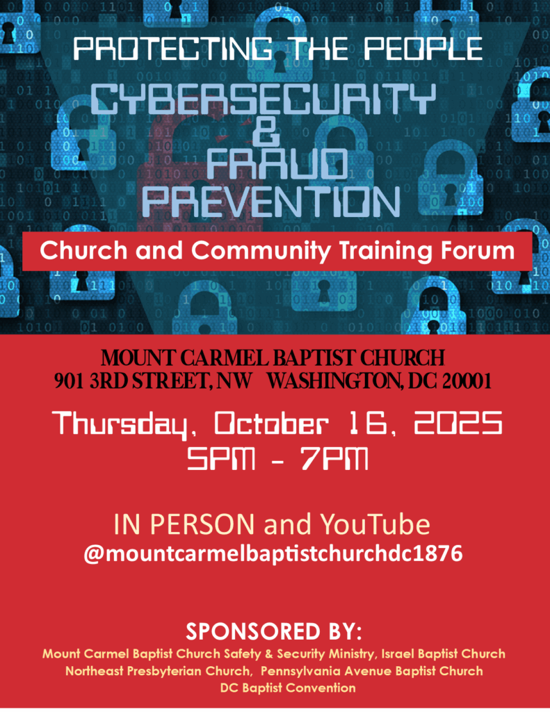 Mount Carmel Baptist Church invites you to join them for a church and community training forum focused on cybersecurity and fraud prevention.