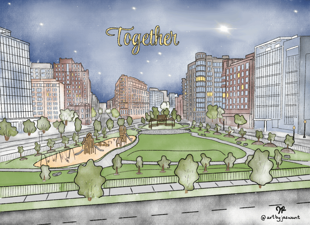 Created by local artist and Mount Vernon Triangle resident Jaswant Pakki and evoking the theme of togetherness, the three designs are intended to lift the spirits of all who receive them. MVT CID has partnered with a few of our local businesses to sell these cards as packs of 3 for $12 with the proceeds going to support Mount Vernon Triangle Community Foundation. Share the season’s greetings by picking up a pack or two (or more!) of cards from the following locations now through January 2: